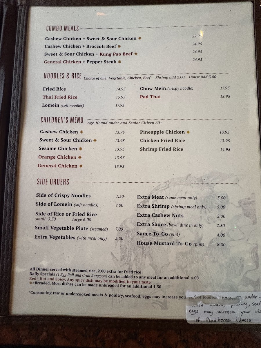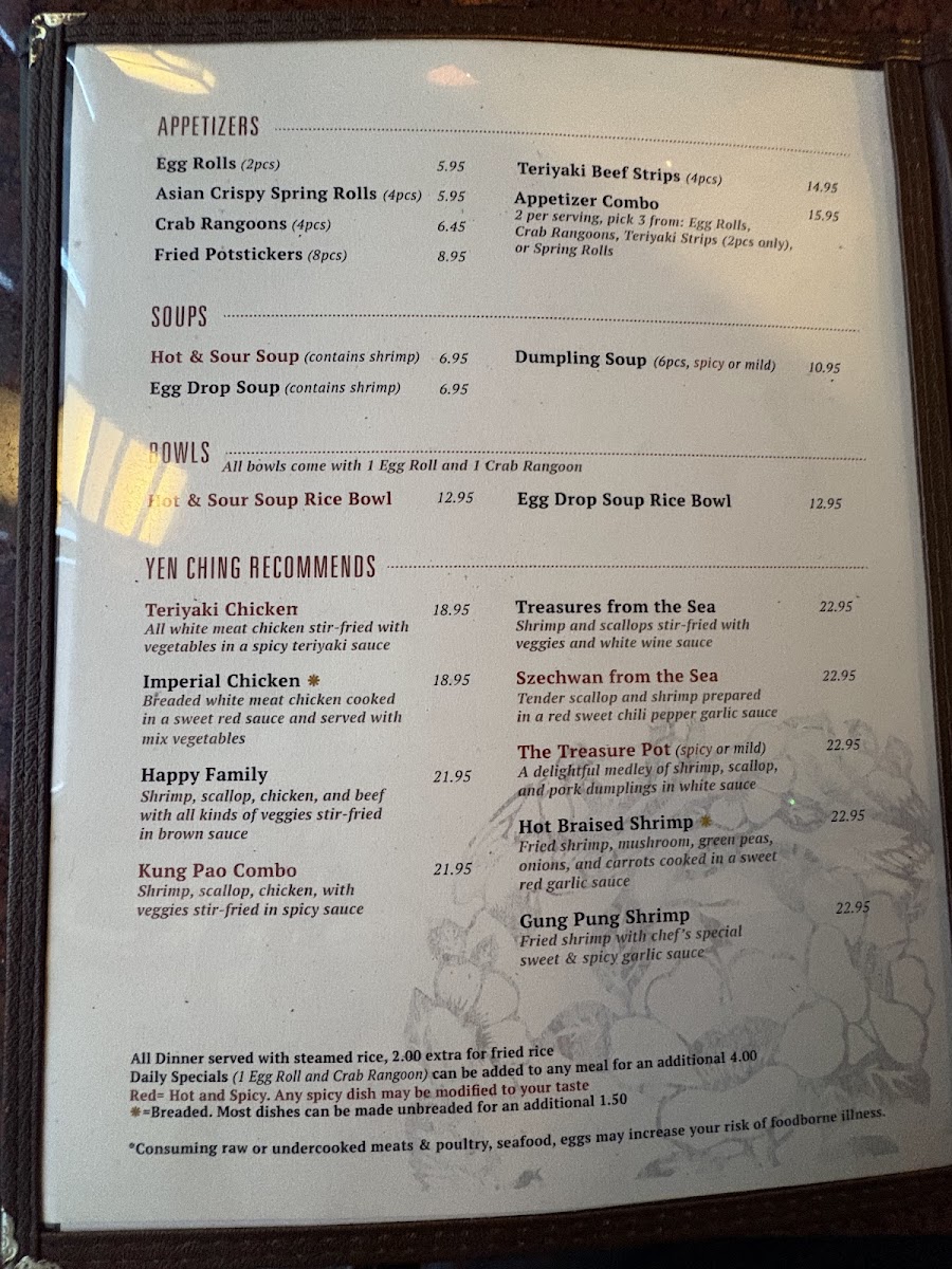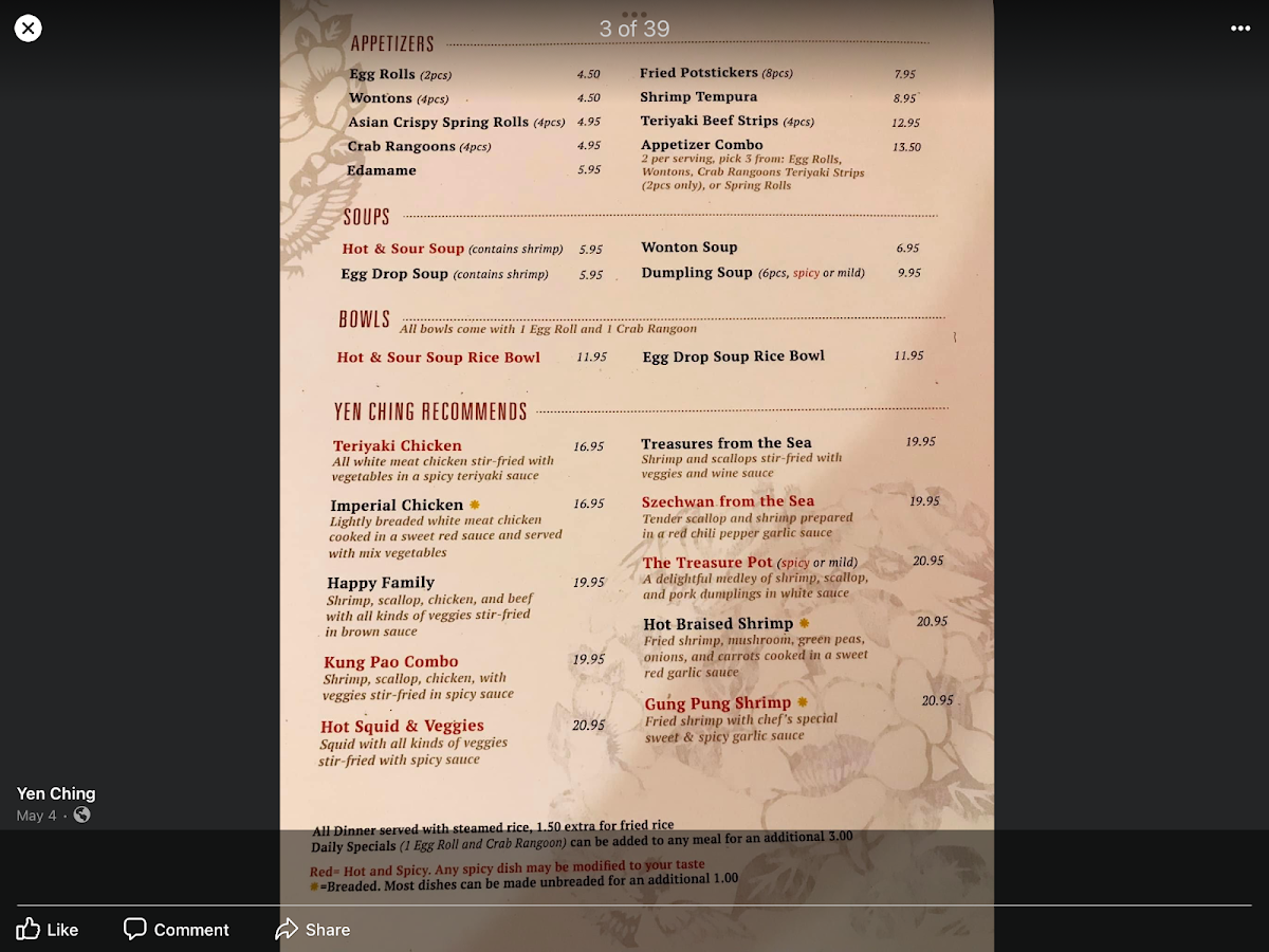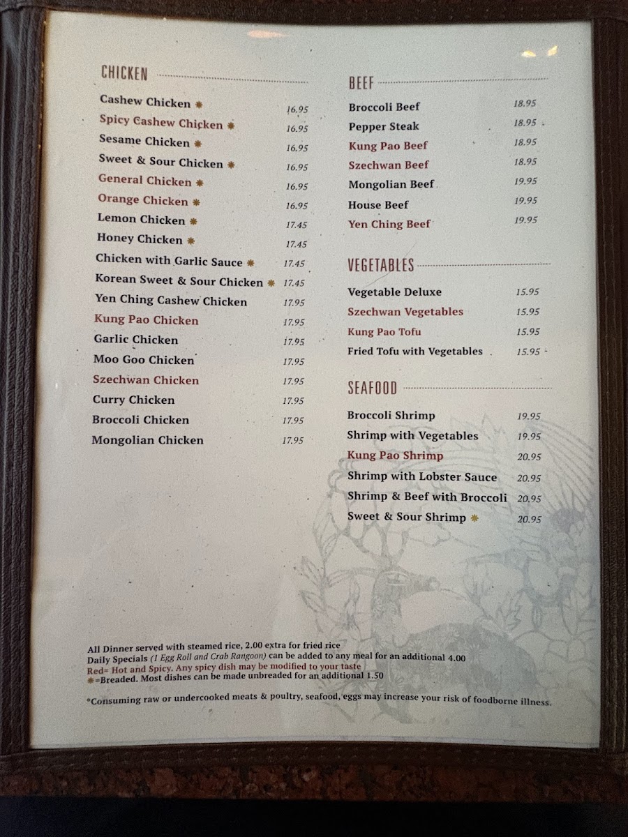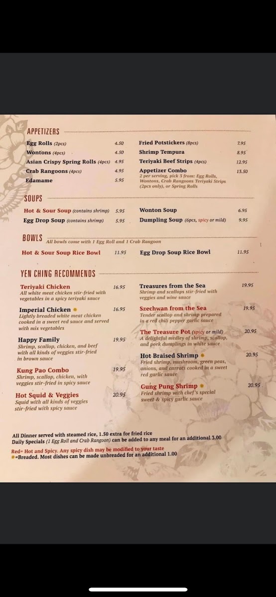 Overall, the menu at Yen Ching provides a variety of options, from flavorful appetizers and hearty main dishes to kid-friendly meals and customizable sides. The prices, although not listed in full detail, reflect a range of affordable choices that make it a great option for a quick and satisfying lunch in Ozark.